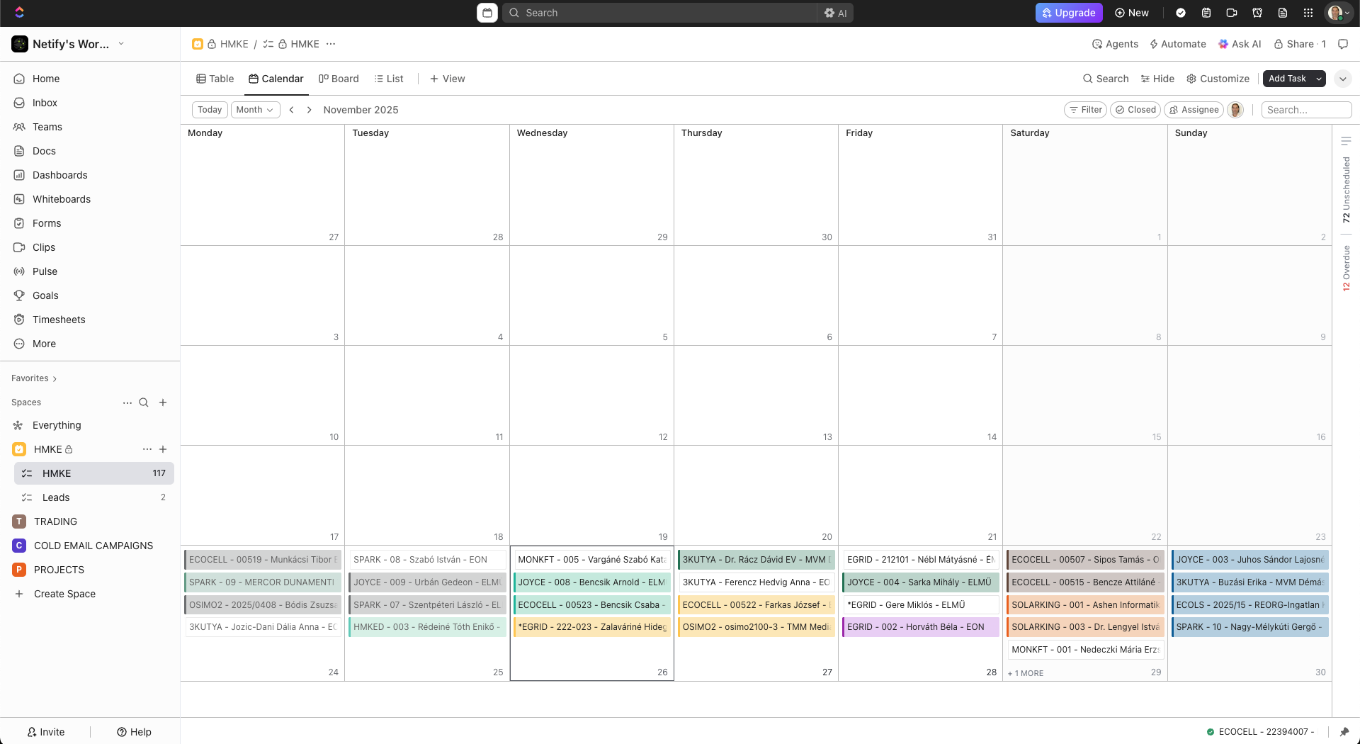 • ClickUp – feladatkezelő, ahol a sales / ügyfélkapcsolat következő lépései feladatként jelennek meg.