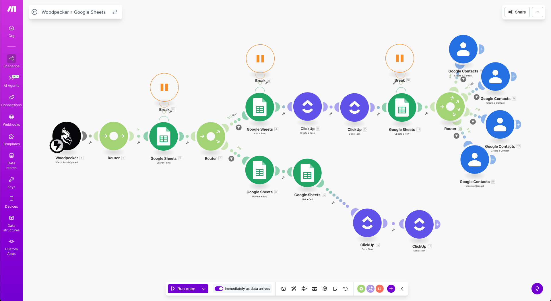 Az alábbi folyamat egy tipikus kisvállalkozói “sales stack”-et köt össze: Woodpecker (hideg e-mail), Google Sheets, ClickUp és Google Contacts.